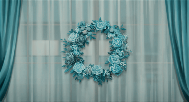 Corona de rosas azules: refleja el misterio o la belleza inalcanzable. es una decoración sobre la mesa de comedor de la familia Ishida.
